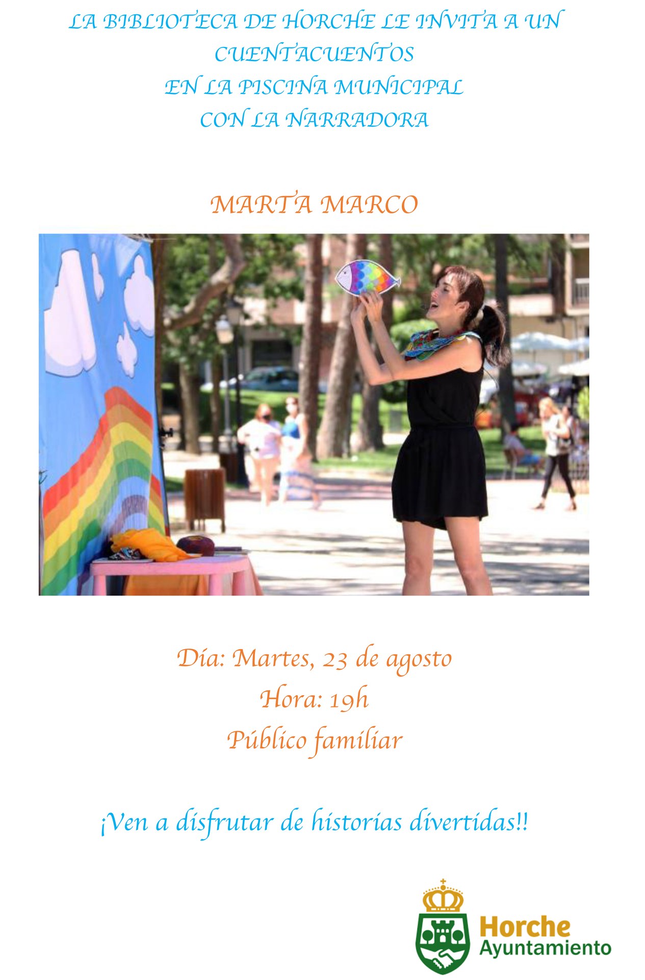 El próximo martes 23 de agosto a las 19 horas, la Piscina Municipal acogerá un cuentacuentos a cargo de la narradora Marta Marco, organizado por la Biblioteca Municipal de Horche y dirigido para un público familiar.