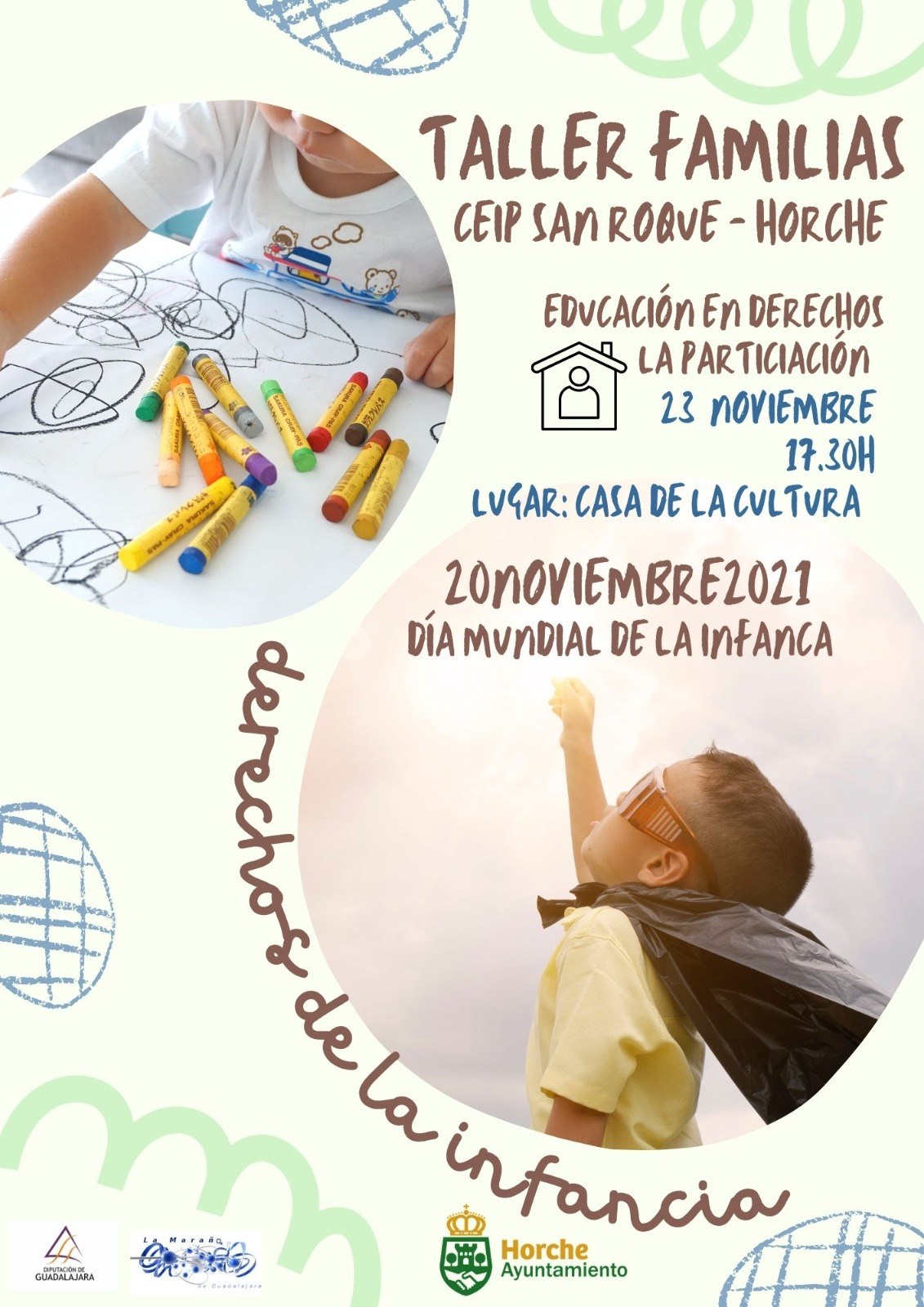 - Con motivo del Día Mundial de la Infancia, que se celebra el sábado 20 de noviembre, el Ayuntamiento de Horche, además de este taller "Educación en Derechos de la Infancia, la participación" para familias el próximo día 23 en la Casa de la Cultura, impartirá también durante los días 15, 17, 18 y 29 de noviembre y el 1, 2 y 3 de diciembre otros talleres para el alumnado del CEIP San Roque.