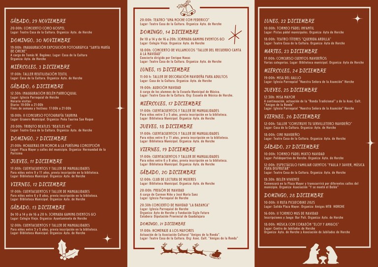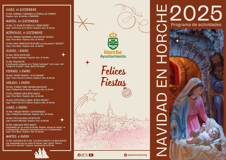El Ayuntamiento de Horche ha presentado su extenso y variado Programa de Navidad 2025, diseñado para ofrecer a vecinos, vecinas y visitantes un mes de diciembre y principios de enero lleno de cultura, tradición, entretenimiento y espíritu navideño. La programación incluye una rica mezcla de conciertos, talleres, teatro, actos religiosos y numerosas propuestas dedicadas a los más pequeños.