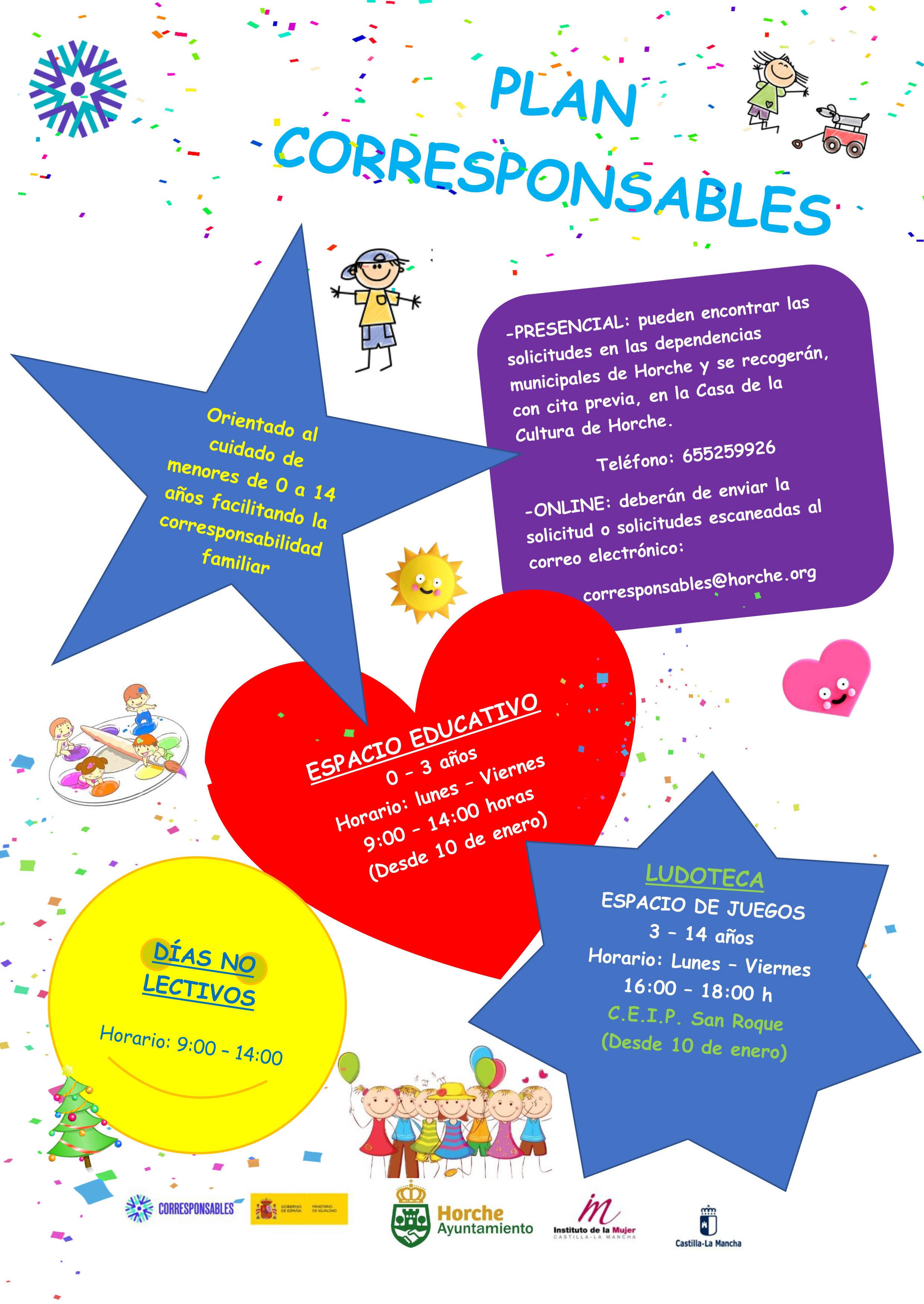 El Ayuntamiento de Horche ha puesto en marcha el Plan Corresponsables, gestionado por el Instituto de la Mujer de Castilla-La Mancha con fondos del Ministerio de Igualdad, y que se enmarca dentro de la nueva política pública de Igualdad de género y tiene como objetivo crear una red de servicios de apoyo a la conciliación de las familias con hijos e hijas menores de 14 años mientras garantiza el cuidado como un derecho desde el principio de igualdad entre mujeres y hombres.