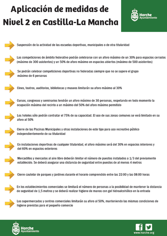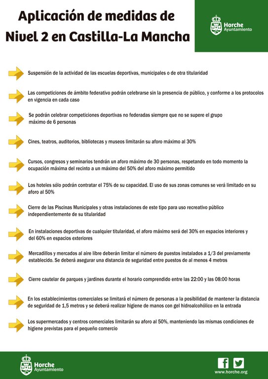 Debido a la exponencial disminución mostrada en el número de casos de COVID-19 en Horche en las últimas dos semanas, únicamente 6 casos en total, la Consejería de Sanidad ha decidido levantar las medidas de nivel 3 de contención de la expansión del citado virus que estaban presentes en nuestra localidad desde el pasado día 11 de diciembre. Las nuevas medidas de nivel 2, que están previstas para todas las localidades de Castilla-La Mancha, son las siguientes: