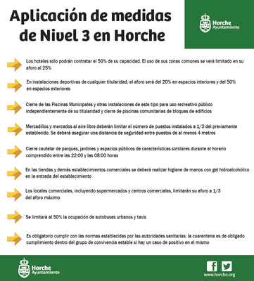 Debido al incremento de casos de COVID-19 en nuestra localidad en la última semana debido a un brote comunitario, la Consejería de Sanidad ha decidido decretar medidas de nivel 3 para Horche con el fin de contener la expansión del citado virus. Dichas nuevas medidas restrictivas, que son adicionales a las que ya estaban en vigor en el nivel 2 previsto para todas las localidades de Castilla-La Mancha, son las siguientes: