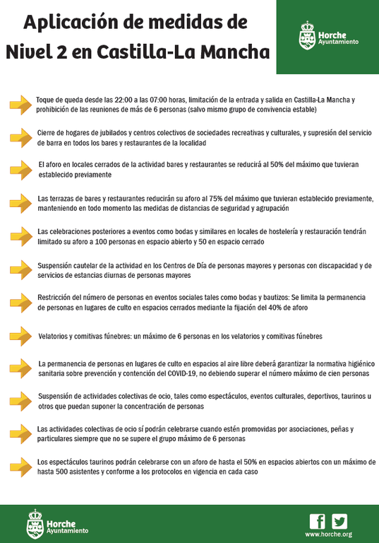 La Consejería de Sanidad ha decretado medidas de nivel 2 en todos los municipios de Castilla-La Mancha, salvo en nueve localidades, con el fin de contener la expansión del COVID-19. Dichas nuevas medidas restrictivas, que flexibilizan las actuales de nivel 3 especiales, son las siguientes: