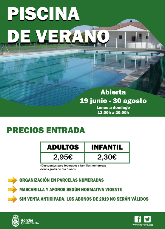 Este año, y debido a la pandemia del COVID-19, la Piscina Municipal estará organizada según parcelas numeradas. Asimismo, las mascarillas y los aforos se regirán según la normativa vigente, mientras que la venta anticipada ha quedado anulada. Por último, los abonos del año 2019 no serán válidos.