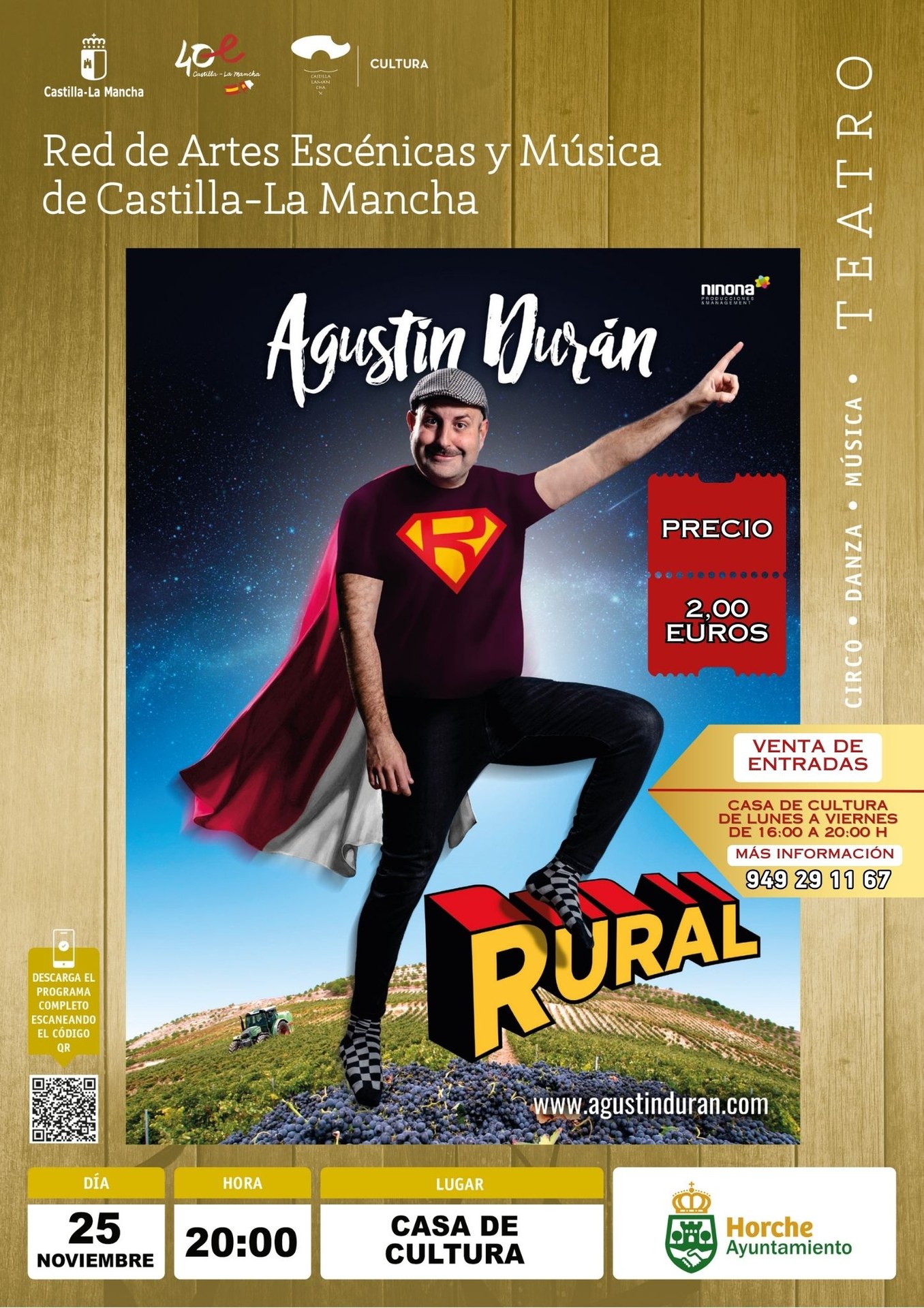 - Gracias a la Red de Artes Escénicas y música de Castilla La Mancha, los vecinos de Horche tendrán la oportunidad de presenciar nuevamente al cómico Agustín Durán que vuelve de nuevo al municipio con su actuación 'Rural'.