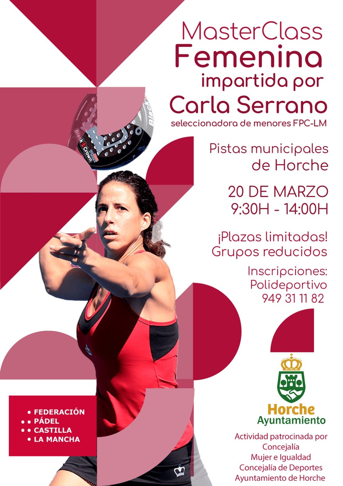 Organizada por la Federación Pádel Castilla-La Mancha y dirigida a mujeres de todas las edades. Tendrá lugar el sábado 20 de marzo en dos horarios: de 9:30 a 11:45 horas y de 11:45 a 14 horas. Las inscripciones se pueden realizar hasta el jueves 18 de marzo a las 23 horas en el Polideportivo Municipal o en el número de teléfono 94931182. Se cumplirá estrictamente con todas las medidas del protocolo COVID-19. ¡Introdúcete por primera vez en el mundo del pádel con la gente de tu pueblo! ¡Os esperamos!
