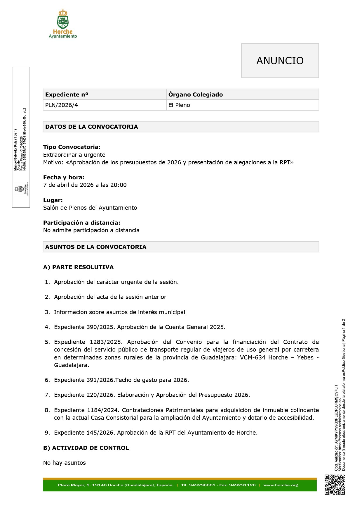 - Motivo: «Aprobación de los presupuestos de 2026 y presentación de alegaciones a la RPT»