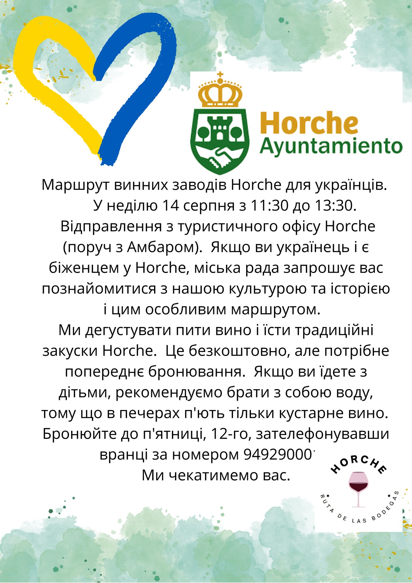 Si eres ucraniano y estás refugiado en Horche, el Ayuntamiento de Horche te invita a conocer nuestra cultura e historia con esta ruta especial. Tomaremos vino y comeremos aperitivos típicos de Horche. Es gratis, pero es necesario reserva previa. Si vas a ir con niños, te recomendamos llevar su propia bebida porque en las cuevas solo se bebe vino artesanal. Hay que reservar antes del viernes 12, llamando en horario de mañana al número del Ayuntamiento (949290001). ¡Te esperamos!