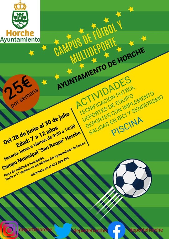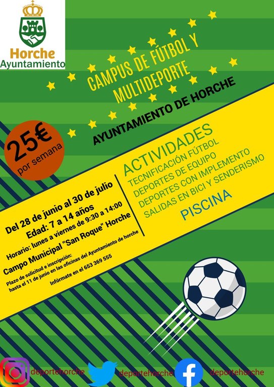Por su parte, el campus de fútbol y multideporte, que tendrá lugar en el Estadio Municipal de San Roque, comenzará una semana más tarde, el día 28 de junio, y se alargará también hasta el 30 de julio. En horario de lunes a viernes de 9:30 a 14 horas y con un precio de 25 euros por semana, los alumnos que se apunten realizarán actividades de tecnificación, así como senderismo, salidas en bicicleta y piscina. El plazo de inscripción, que debe realizarse en las oficinas del Ayuntamiento, acaba igualmente el 11 de junio. Se puede ampliar la información en el número de teléfono 653369555.
