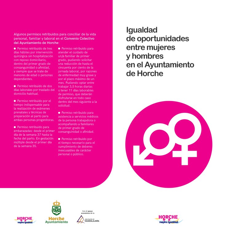 En concreto, en el folleto, titulado ‘Igualdad de oportunidades entre mujeres y hombres en el Ayuntamiento de Horche’, se puede encontrar la lista de algunos de los permisos retribuidos para conciliar la vida personal, familiar y laboral presentes en el Convenio Colectivo del Ayuntamiento de Horche, así como los principales resultados diagnósticos encontrados en el Plan de Igualdad. Son los siguientes: en el Ayuntamiento de Horche hay más mujeres que hombres, se observan puestos más feminizados y puestos más masculinizados y, por ello, el Ayuntamiento va a trabajar para visibilizar a hombres y mujeres indistintamente en todos los puestos, el Ayuntamiento quiere favorecer el lenguaje inclusivo, en el Convenio Colectivo se ha acordado la elaboración de un protocolo de prevención del acoso laboral por razón de sexo y del acoso sexual, y el Ayuntamiento por acuerdo colectivo trabaja por la adecuación de la organización del trabajo a las necesidades de conciliación de la vida personal, familiar y laboral de las personas trabajadoras.