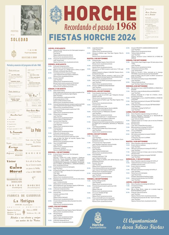 Entérate de todo lo que habrá en las Fiestas de Horche 2024El Ayuntamiento de Horche ha dado a conocer el cartel del programa de las Fiestas de Horche 2024, que hace un guiño de recuerdo a las fiestas que tuvieron lugar en la localidad en 1968, incluyendo detalles como la portada del programa de ese año y algunos de los anuncios que se publicaron en esa edición.https://www.horche.org/actualidad/noticias/enterate-de-todo-lo-que-habra-en-las-fiestas-de-horche-2024https://www.horche.org/actualidad/noticias/enterate-de-todo-lo-que-habra-en-las-fiestas-de-horche-2024/@@download/image/2Cartel recordando Fiestas Horche 20244.jpg