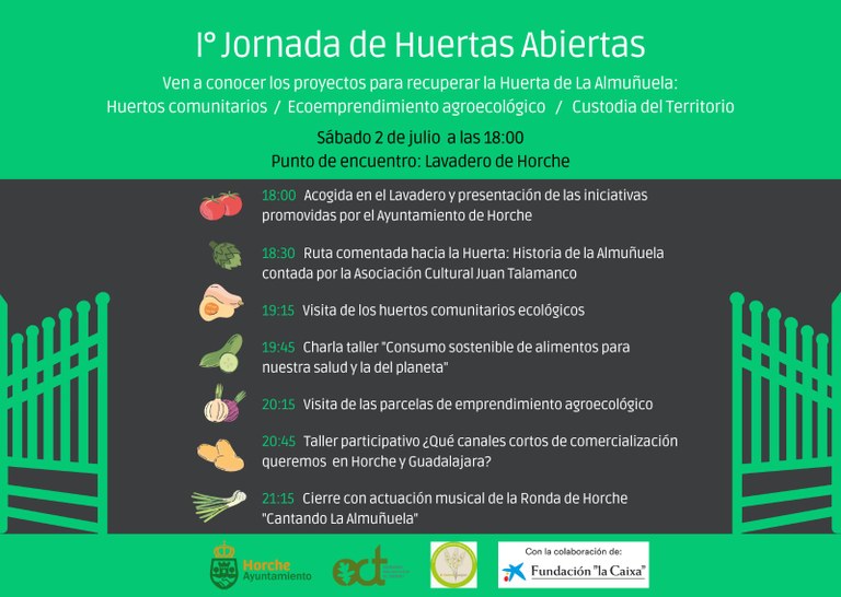 Horche celebrará este sábado sus primeras jornadas de ‘Huertas Abiertas’, organizadas por el Ayuntamiento horchano y el Observatorio para una Cultura del Territorio en colaboración con la Fundación La Caixa. La cita, que servirá para dar a conocer el proyecto de ecoemprendimiento agroecológico con huertos comunitarios para la recuperación de las huertas de La Almuñuela, comenzará a las 18 horas en el Lavadero y contará con una ruta histórica, varios talleres participativos y sostenibles, una visita a los citados huertos ecológicos de La Almuñuela y una actuación musical de la Ronda de Horche.