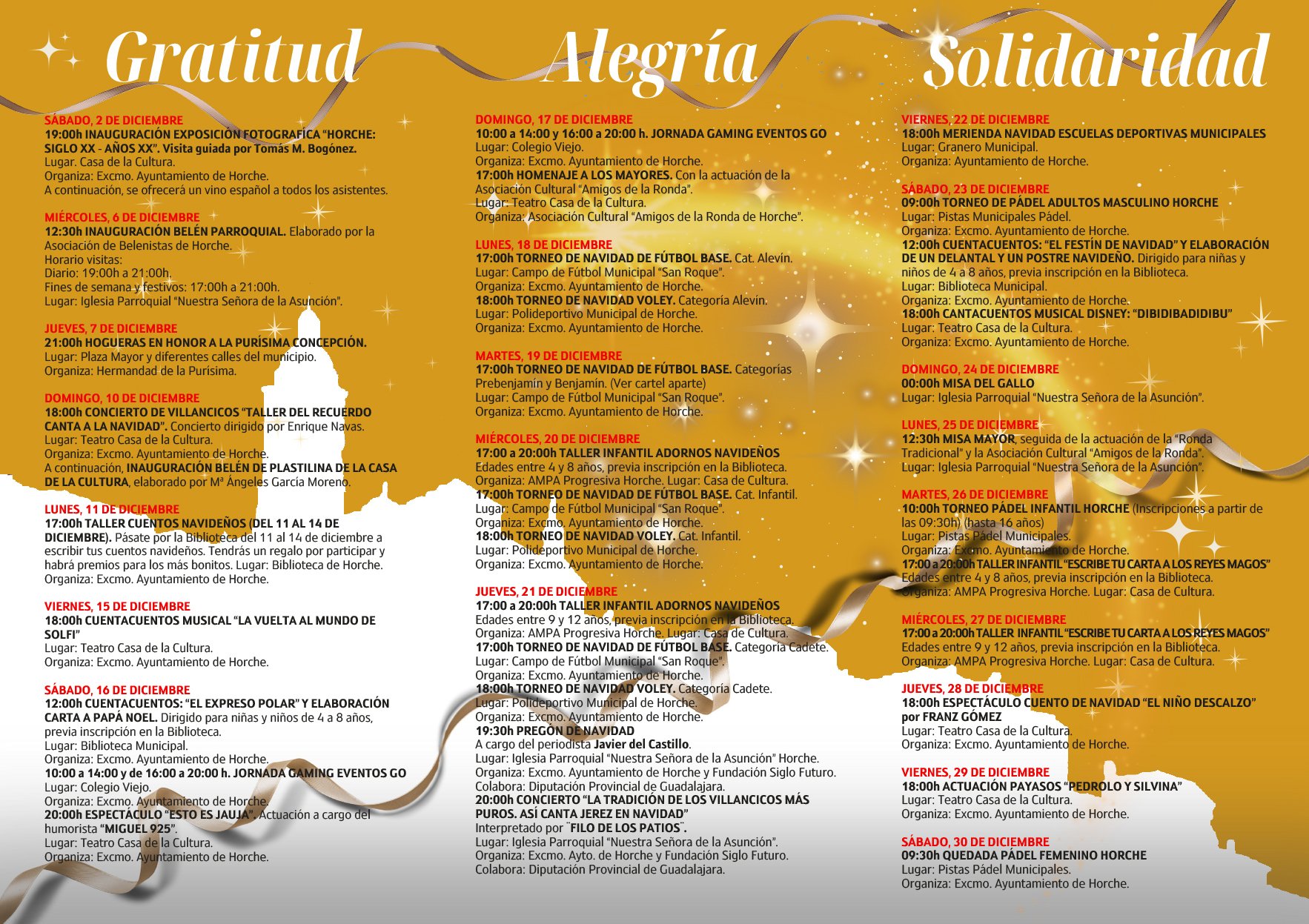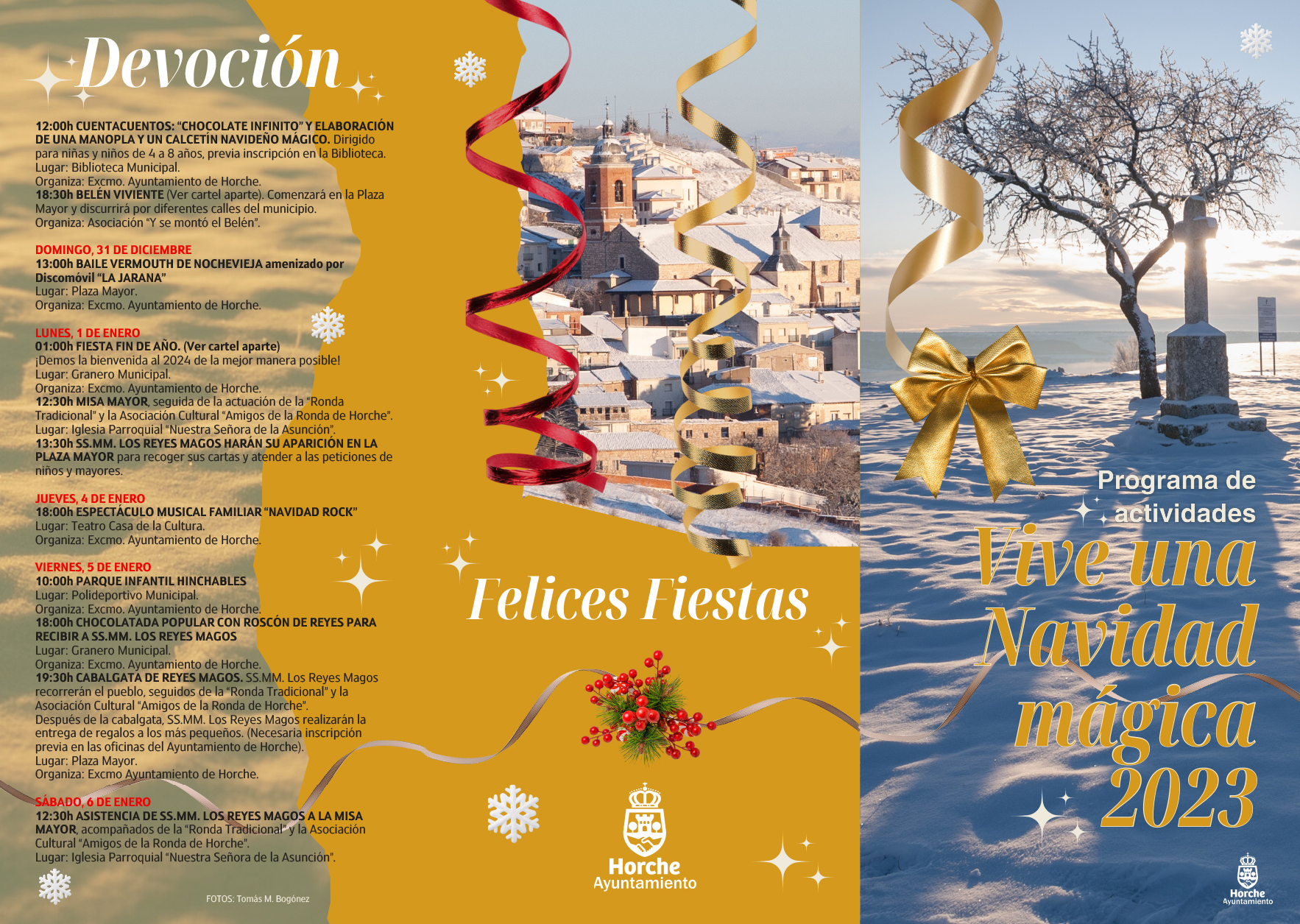 Bajo los lemas de Gratitud, Devoción, Alegría y Solidaridad, el Ayuntamiento de Horche ha confeccionado una programación navideña cargada de actos y actividades para todos los públicos y en la que se ha mantenido la esencia de la tradición y familiaridad de estas fechas sin obviar el carácter festivo.