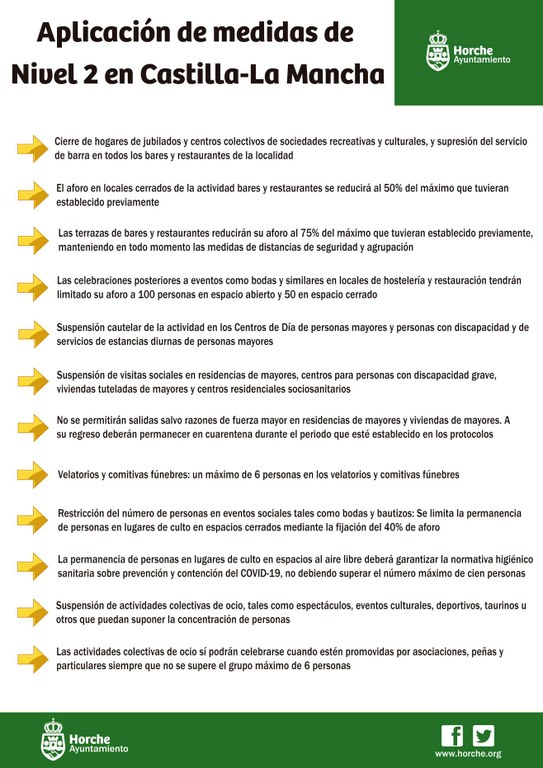 Debido a la exponencial disminución mostrada en el número de casos de COVID-19 en Horche en las últimas dos semanas, únicamente 6 casos en total, la Consejería de Sanidad ha decidido levantar las medidas de nivel 3 de contención de la expansión del citado virus que estaban presentes en nuestra localidad desde el pasado día 11 de diciembre. Las nuevas medidas de nivel 2, que están previstas para todas las localidades de Castilla-La Mancha, son las siguientes: