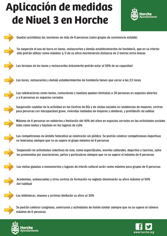 Debido al incremento de casos de COVID-19 en nuestra localidad en la última semana debido a un brote comunitario, la Consejería de Sanidad ha decidido decretar medidas de nivel 3 para Horche con el fin de contener la expansión del citado virus. Dichas nuevas medidas restrictivas, que son adicionales a las que ya estaban en vigor en el nivel 2 previsto para todas las localidades de Castilla-La Mancha, son las siguientes: