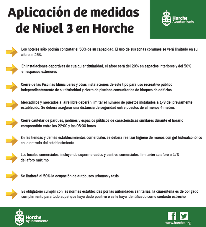 La Consejería de Sanidad ha decidido prorrogar las medidas de nivel 3 implantadas en Horche con el fin de contener la expansión del COVID-19. Dicha extensión entrará en vigor mañana martes día 23 y estará implantada, como mínimo, otros diez días más. Os recordamos que las actuales medidas restrictivas de nivel 3 implantadas en Horche, que son adicionales a las que ya estaban en vigor en el nivel 2 previsto para todas las localidades de Castilla-La Mancha, son las siguientes:
